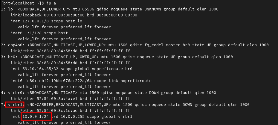 네트워크 브릿지는 10.0.0.0/24 사설 네트워크 서브넷을 사용하고 브릿지 인터페이스 virbr1에 대해 IP 주소 10.0.0.1을 할당합니다.