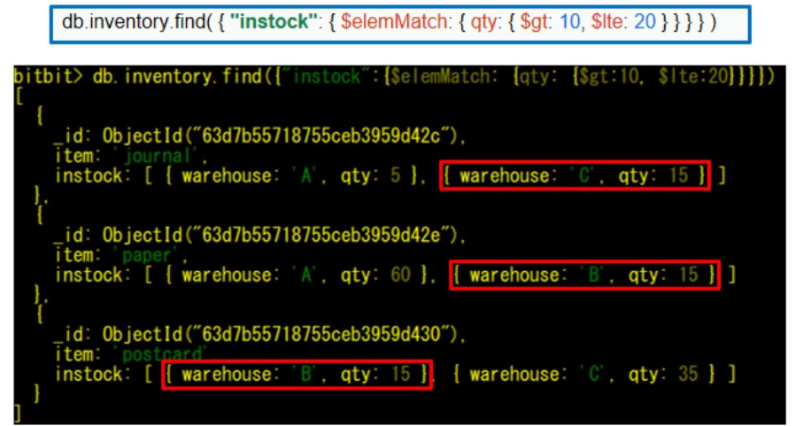 - { 필드: { $elemMatch: { 필드: { $연산자: { 조건 } } } } }